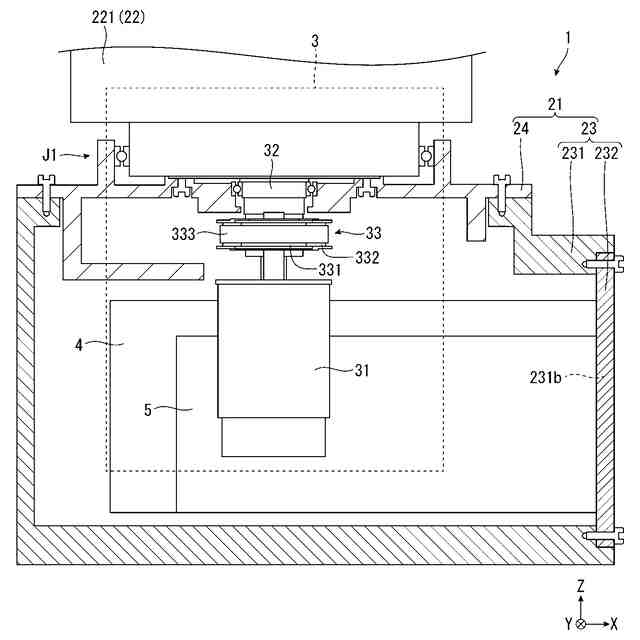 図1は、第1実施形態に係るロボットを示す側面図である。図2は、基台をX軸方向プラス側から見た断面図である。図3は、基台をY軸方向マイナス側から見た断面図である。図4ないし図9は、それぞれ、基台の組み立て手順を説明するための断面図である。図10ないし図13は、それぞれ、基台の変形例を示す断面図である。