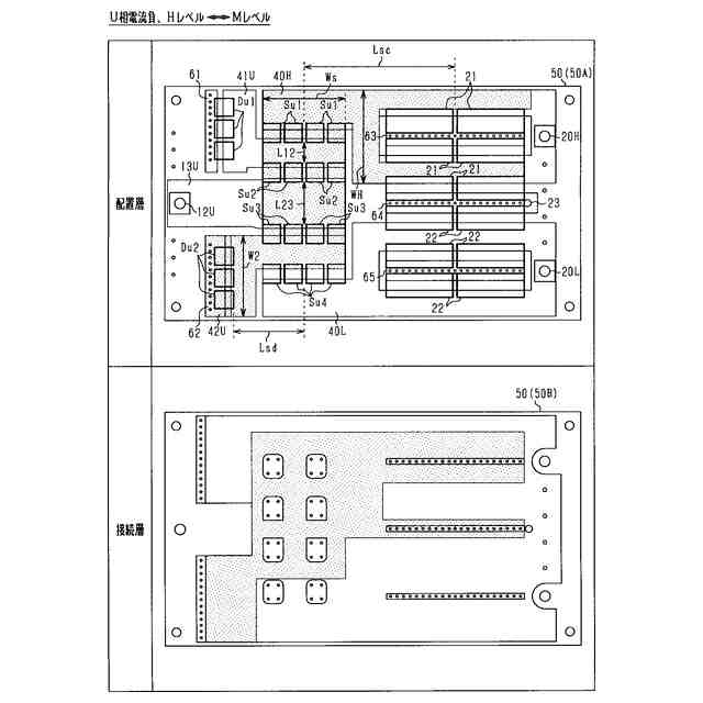 【解決手段】3レベルインバータ30は、第1,第2コンデンサ21,22と、U,V,W相第1~第4スイッチSu1~Su4,Sv1~Sv4,Sw1~Sw4と、U,V,W相第1,第2ダイオードDu1,Du2,Dv1,Dv2,Dw1,Dw2とが実装された基板を備えている。基板は、各コンデンサ21,22、各スイッチSu1~Su4,Sv1~Sv4,Sw1~Sw4及び各ダイオードDu1,Du2,Dv1,Dv2,Dw1,Dw2が配置された配置面と、配置面とは異なる面であり、各コンデンサ21,22及び各ダイオードDu1,Du2,Dv1,Dv2,Dw1,Dw2を電気的に接続する各相第3配線43U,43V,43Wが形成された接続面とを有する。
