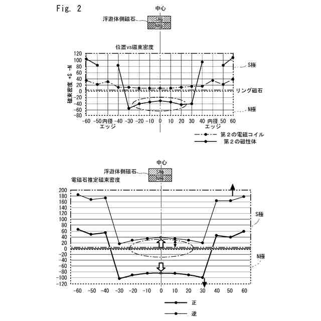 前記浮遊ベース装置が備える第1の電磁コイルが、前記第1の磁性体に作用して前記浮遊体の位置を決め、