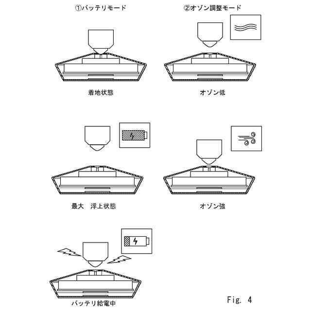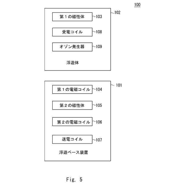 第1の磁性体と、受電コイルと、前記受電コイルから受けた電力を用いてオゾンを発生するオゾン発生器と、を備える浮遊体が浮遊ベース装置上に配置され、