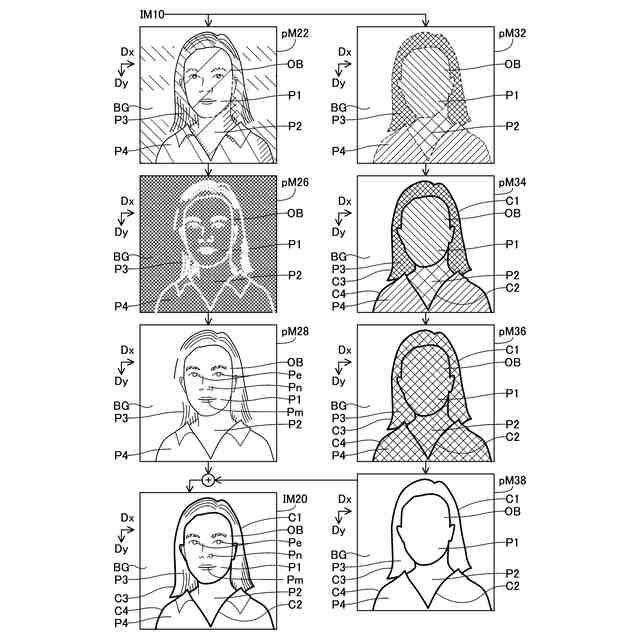 [適用例1]プログラムであって、オブジェクトを表す対象画像を取得する第1の取得機能と、前記オブジェクトの輪郭を表す輪郭画像と、前記輪郭画像よりも前記オブジェクトの細かい特徴を表す細部画像と、を取得する第2の取得機能と、前記輪郭画像と前記細部画像とを含む複数の画像を合成することによって合成画像を生成する合成機能と、訓練済の機械学習モデルに前記合成画像を含む情報を入力することによって、新たな画像を取得する第3の取得機能と、をコンピュータに実現させるプログラム。