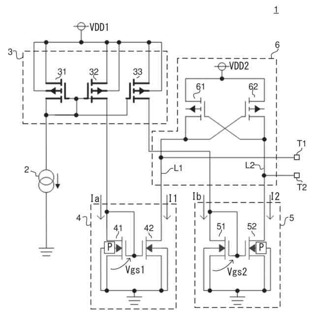 従来、トランジスタへのホットキャリア注入を利用した不揮発性メモリ装置がある。この種の不揮発性メモリ装置は、初期状態において特性が揃えられた第1および第2トランジスタをメモリ素子として備え、いずれか一方のトランジスタに対してのみホットキャリアを注入してトランジスタの特性を変化させる。その後のリード動作では、第1および第2トランジスタに共通のゲート電圧を供給したときのドレイン電流の大小関係に基づき、“0”のデータが記憶されているのか、“1”のデータが記憶されているのかを読み出す。例えば、第1トランジスタのドレイン電流のほうが小さい状態(第1トランジスタの特性が変化した状態)は“0”のデータが記憶されている状態に相当し、第2トランジスタのドレイン電流のほうが小さい状態(第2トランジスタの特性が変化した状態)は“1”のデータが記憶されている状態に相当する。