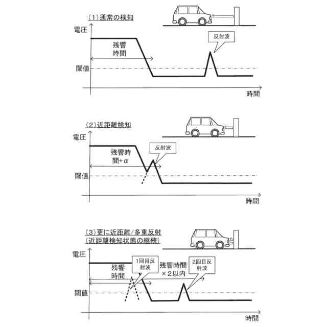 このような検出センサは、例えば超音波、ミリ波、赤外線等の探査波を出力するとともに出力した探査波が対象物に反射して戻ってくるまでの時間を計測し、対象物までの距離を検出する。ここで、特に超音波センサに関しては探査波を送信した直後に生じる探査波の残響(振動子の減衰振動)の影響により、ごく近い距離にある対象物については残響に反射波が埋もれてしまい検出することが難しい問題があった。また、検知範囲を広げるためにはより長く振動子を振動させる必要があることから残響時間が長くなり、結果的に近い距離の対象物がより検出し難くなる。そこで、特許第6311516号公報には反射波を受信できなくとも探査波を送信した直後の残響時間が通常より長くなった場合には、車両に対して近距離に対象物が存在すると検出する技術について開示されている。但し、上記残響時間の伸びは対象物が更に接近すると反射波が残響に完全に埋もれてしまい消失することとなる。そこで、対象物が車両に対して更に接近することで残響時間の伸びが消失した状態でも対象物が検出した状態(以下、近距離検知状態という)を維持するために、多重反射による2回目の反射と予想される反射波を受信した場合については、残響時間の伸びが無くなっても近距離検知状態を維持する技術についても提案されている。