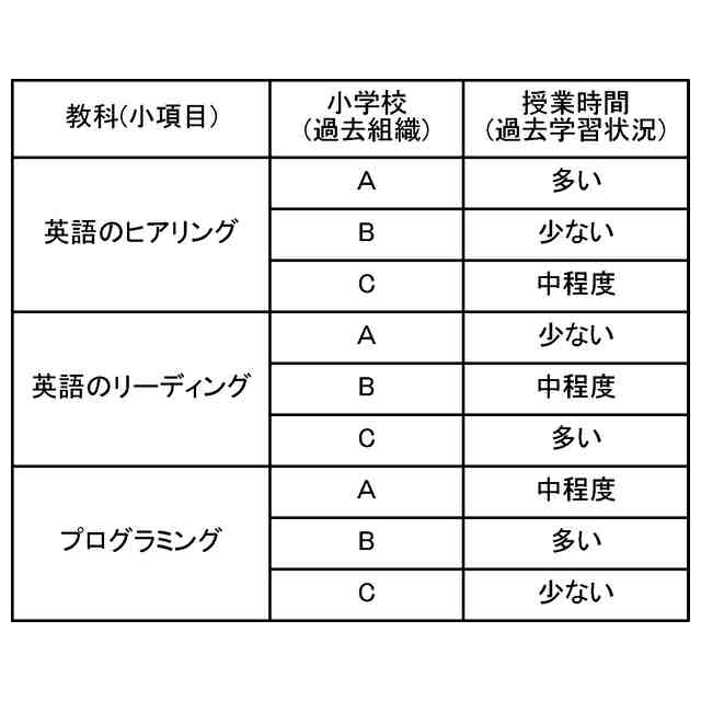 ところで、中学校での生徒の学習評価については、テスト結果等により決められるのが通常である。また、先生(教師)は、生徒の学習評価に応じて個別指導の要否や指導の優先順位などの指導内容を決めることになる。ここで、中学校では、複数の小学校から小学6年生が進学して集まってくることが多く、小学校ごとに所定科目における学習状況(例えば、授業時間)が異なっている場合が多い。例えば、小学校ごとにプログラミングや英語への教育の力の入れ方が異なる。