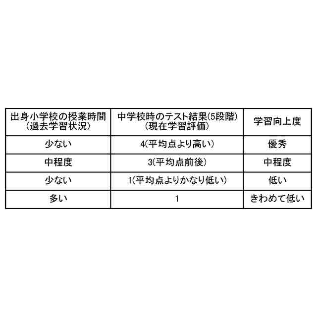 また、仮に、中学校で所定科目の学習評価が同一の2人の生徒が、互いに異なる小学校で所定科目の学習評価が同一であったとしても、この所定科目について、授業時間が多い小学校出身の生徒と、授業時間が少ない小学校出身の生徒とでは、前者の方が、小学校時点での学習到達度が高く、その分、現在の学習向上度は低いといえる。
