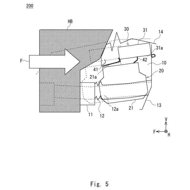 図1に示す車両が前面衝突した時の車両の前部を示す側面図である。