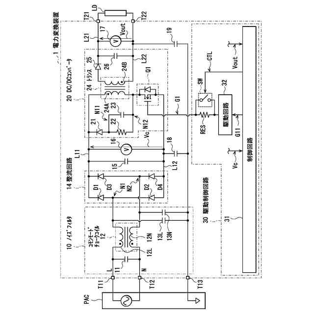 図1は、本発明の一実施の形態に係る電力変換装置(電力変換装置1)の一構成例を表すものである。電力変換装置1は、系統電源などの交流電源PACから供給された交流電圧を直流電圧に変換し、変換された直流電圧を負荷装置LDに供給するAC/DCコンバータである。電力変換装置1は、端子T11,T12,T13と、ノイズフィルタ10と、整流回路14と、キャパシタ15と、電圧センサ16と、DC/DCコンバータ20と、電圧センサ17と、キャパシタ18,19と、駆動制御回路30と、端子T21,T22とを備えている。