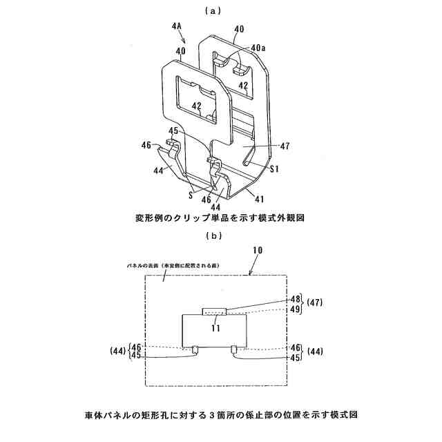 図10は特許文献1に開示のクリップを示し、(a)はクリップの単品図、(b)はアシストグリップに装着されたクリップを車体パネルの矩形孔に係合した取付状態を示す断面図である。このクリップ11は、車室内装品であるアシストグリップ1に取り付けられた状態で、両側の係止部13が車体パネル23の矩形孔(嵌合孔)24に対し押入操作により取り付けられる。すなわち、クリップ11は、U字形の本体12、及び本体12のU字形の両壁部34の端部から屈曲部14を介し折り曲げられて矩形孔24に圧接する係止部13,13を備えている。