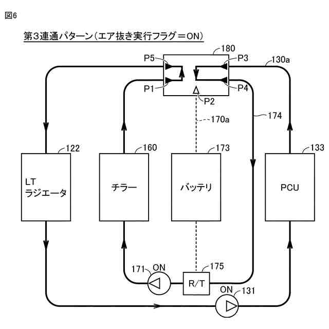 ここで、上記特許文献1には明記されていないが、五方弁の状態を制御することにより、PCUが接続される経路(第1流路)またはバッテリが接続される経路(第2流路)と、リザーブタンクとが接続されない回路が一時的に形成される場合がある。この場合、リバーブタンクと接続されていない経路において気泡が混入(残留)する恐れがある。