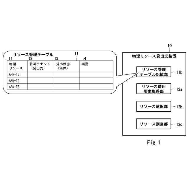 【解決手段】物理リソース貸出元装置であって、貸出可能な物理リソース、当該物理リソースに対応付けられた許可テナント及び貸出状態を項目として含むリソース管理テーブルを記憶するリソース管理テーブル記憶部と、貸出先から送信される物理リソース借用要求を取得するリソース借用要求取得部と、前記物理リソース借用要求に基づき、前記貸出可能な物理リソースの中から前記貸出先に貸し出す物理リソースを選択するリソース選択部と、前記物理リソース借用要求の送信元の貸出先に選択された前記物理リソースを割り当てるリソース割当部と、を備える。