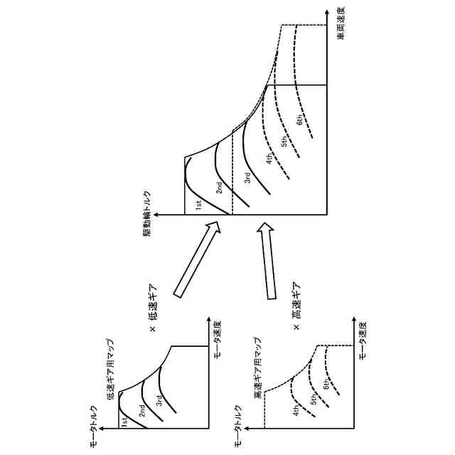 各変速比用のマップでは、当該変速比に関連付けられた1又は複数のシフトポジションにおける前記モータ速度と前記モータトルクとの関係が定義されている