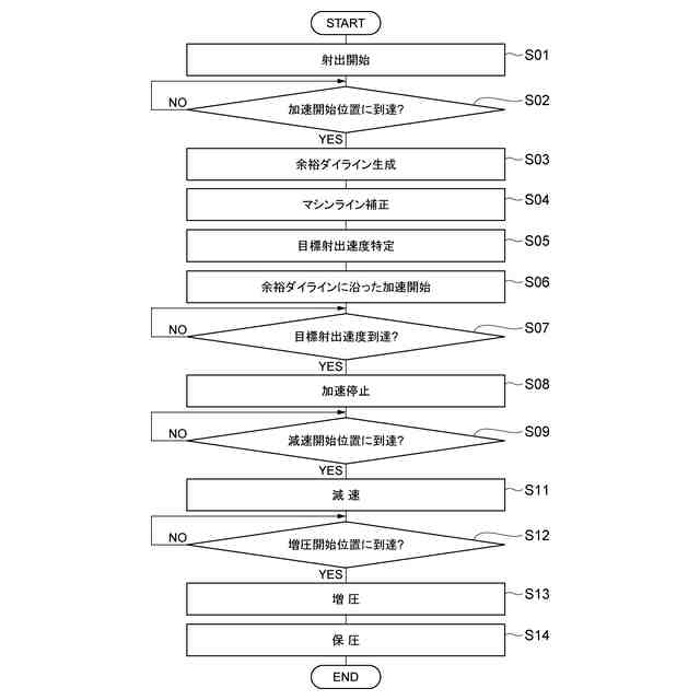 前記制御手段は、前記射出速度を前記目標射出速度まで加速させた後に、射出力を前記ダイラインに対応する値まで低下させる、