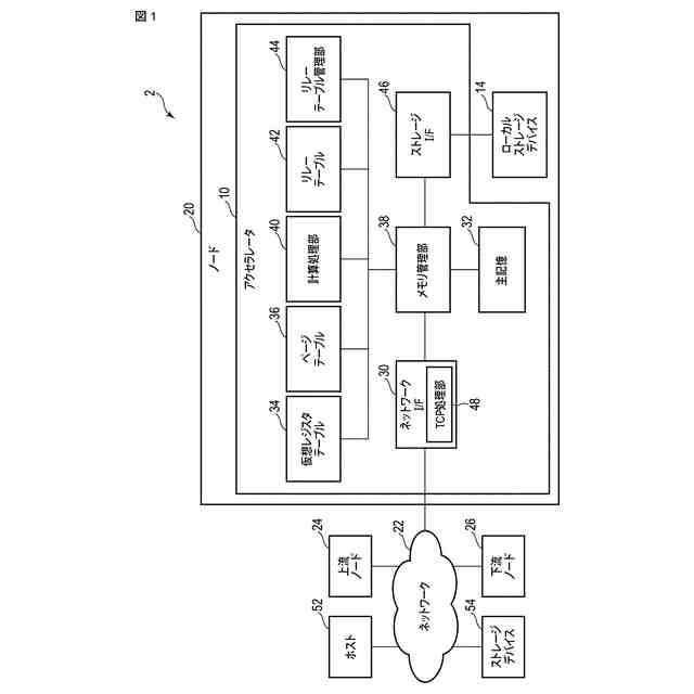 【解決手段】実施形態に係るコントローラにおいて、接続部は、第1データとI/Oコマンドを第1ノードから受信し、第1データに対する計算処理結果である第2データとI/Oコマンドを第2ノードに送信する。メモリは第1データを格納する。仮想レジスタテーブルは、計算処理を表す計算オプションに基づいて特定される仮想レジスタ番号を、計算オプションに従って計算命令を処理するために用いられる第3データの仮想アドレスと第3データのデータサイズとに対応付けて保存する。メモリ管理部は第1データをメモリに書き込み、仮想レジスタテーブルを更新する。計算処理部は仮想レジスタテーブルを参照して、第1データに対して計算処理を実行する。リレーテーブルは、送信元の情報と宛先情報の対を複数記憶する。