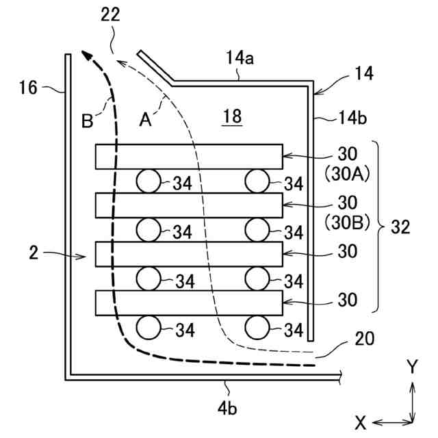 本実施形態の液冷式抵抗器における液体の流れを説明するための側面図である。