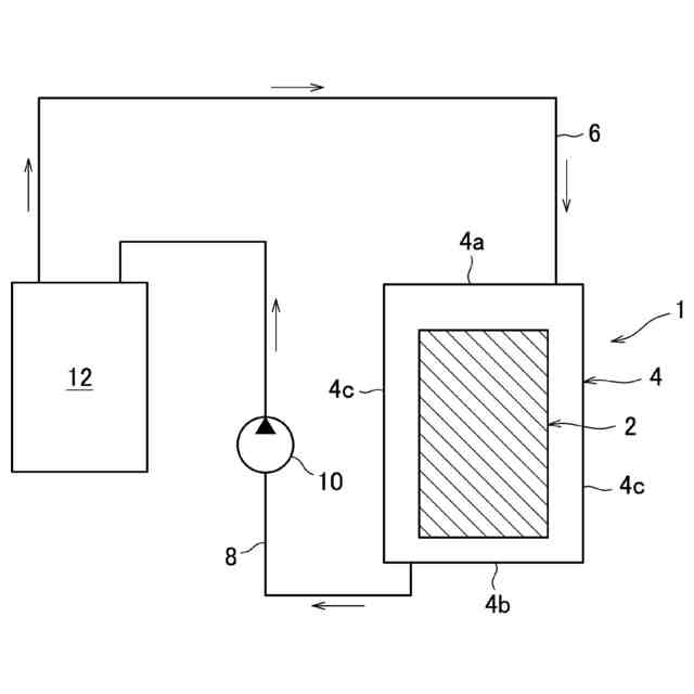 以下、本発明の一実施形態に係る液冷式抵抗器1について図面を参照して説明する。図1は、本発明の一実施形態に係る液冷式抵抗器1が組み込まれる冷却システムの構成図を示す。液冷式抵抗器1は、抵抗ユニット2を冷却容器4の後述する収容空間18に収容して冷却する。液体は、冷却媒体であって、例えば絶縁油であり、少なくとも収容空間18において抵抗ユニット2の全体が液体で浸されるまで充填される。冷却容器4の上壁4aと下壁4bとには、それぞれ液体が流れる入口配管6と出口配管8とが接続されている。