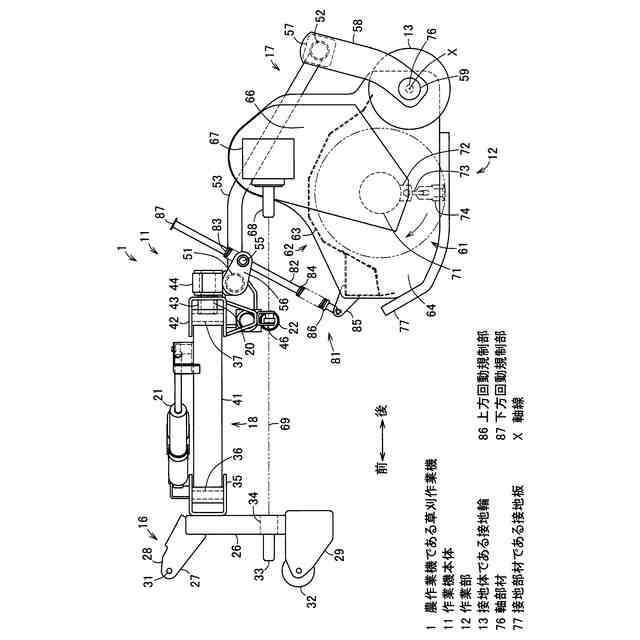 作業部の接地体は、所定の軸線が軸芯を通る左右方向の軸部材を中心として回転可能であり、