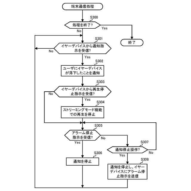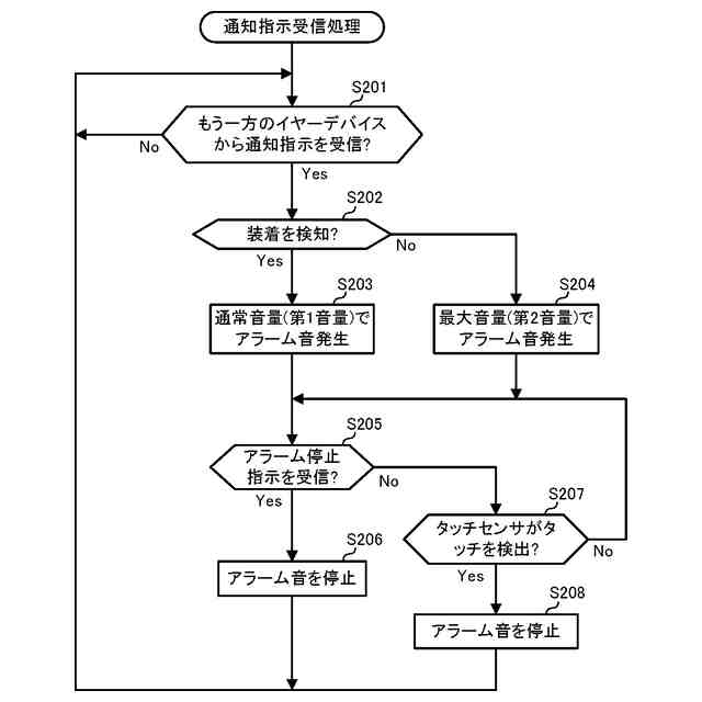 前記もう一方のイヤーデバイスから通知指示を受信したら、前記装着検知部が装着を検知している場合に、通常音量でアラーム音を発生させる、