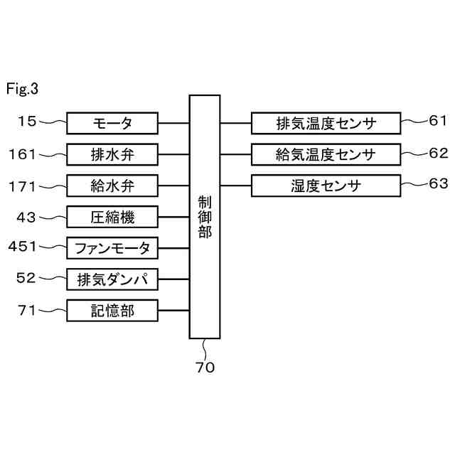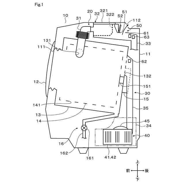 衣類乾燥機10は、外箱11、扉12、水槽13、回転槽14、モータ15、排水機構16、給水機構17、及び乾燥機構20を備えている。なお、図1において、衣類乾燥機10の設置面側つまり鉛直下側を衣類乾燥機10の下側とし、設置面と反対側つまり鉛直上側を衣類乾燥機10の上側とする。衣類乾燥機10のユーザから見て手前側つまり図1の紙面左側を衣類乾燥機10の前方側とし、ユーザの反対側つまり図1の紙面右側を衣類乾燥機10の後方側とする。