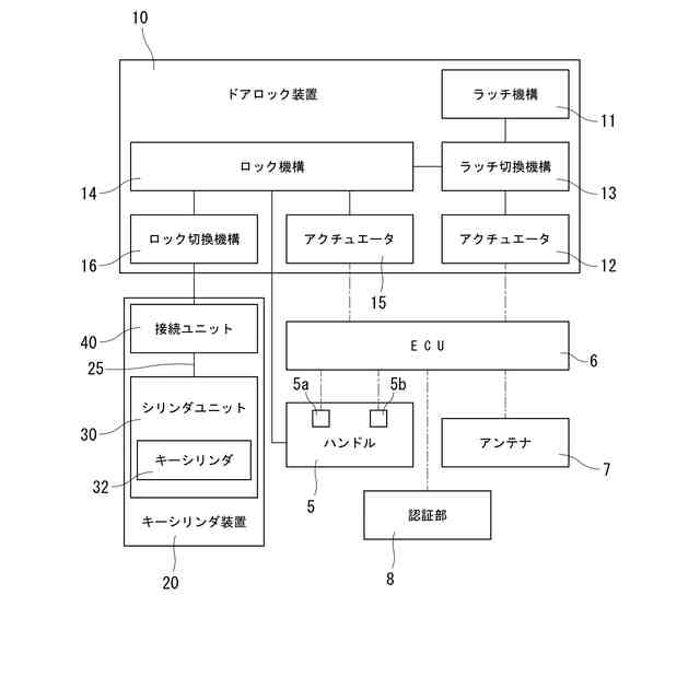 図1のドアロック装置、ハンドル、及びキーシリンダ装置の関係を示すブロック図。