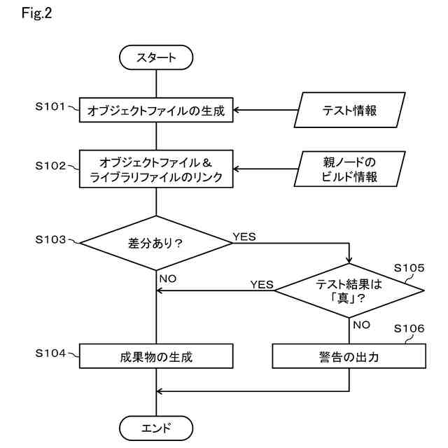 【解決手段】コンパイラドライバ21は、構成管理ツールを介して構成管理データベース4から取得した変更前の親ソースコードに対して所定の変更が加えられた変更後の子ソースコードに対してコンパイル処理を行うときに子ソースコードに対応するテスト情報を埋め込む埋め込み処理を実行する機能と、親ソースコードについてのコンパイル処理に関するコンパイル情報を取得する取得処理を実行する機能と、親ソースコードのコンパイル情報と子ソースコードのコンパイル情報とを比較する比較処理を実行する機能と、を備える。コンパイラドライバ21は、リンク処理を実行するときに比較処理を実行し、2つのコンパイル情報に差分がない場合にはリンク処理の実行を継続し、2つのコンパイル情報に差分がある場合にはテスト情報に基づいてリンク処理の実行を継続するか否かを判断する。