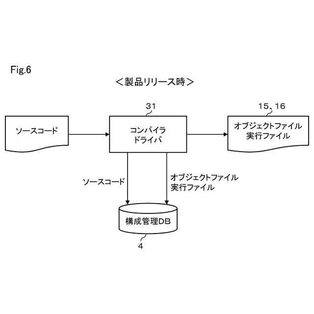 さらに、製品としてリリースするための前記実行ファイルを生成するとき、使用した前記子ソースコードと、生成された前記オブジェクトファイルおよび前記実行ファイルと、を、前記構成管理ツールを介して前記データベースに登録する機能を備える請求項1に記載のコンパイラドライバ。