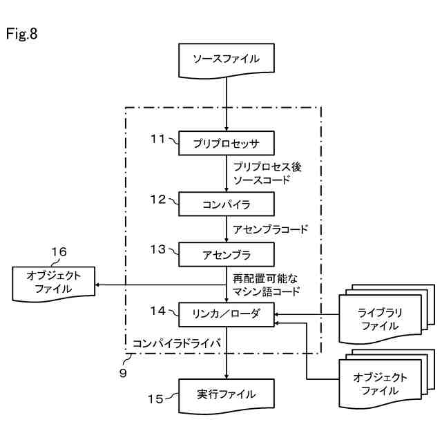 図8に示すように、一般的には、プログラムソースファイルから実行可能なプログラムファイルを作成する際には、次のような処理が必要となる。