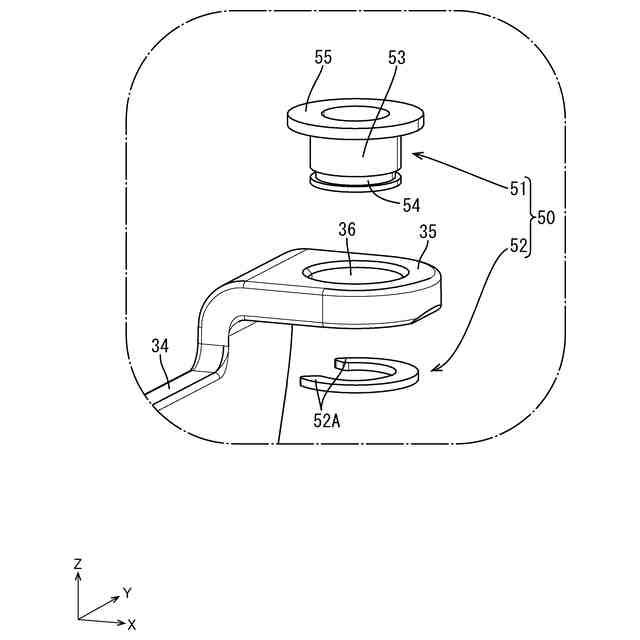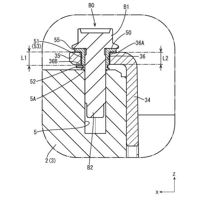 前記カラーは、前記挿通孔の一側開口縁部に係止する一側係止部と、前記挿通孔の他側開口縁部に係止する他側係止部と、を有し、