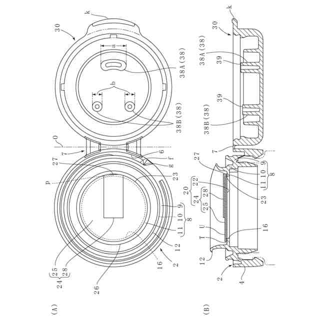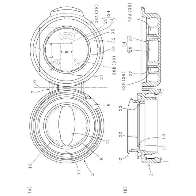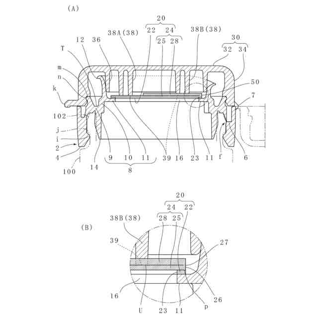 本手段では、図1(A)に示す如く、前記中蓋24は、前記副膜部25と、この副膜部25に連設させた膜状の摘み部28とからなる膜状蓋である。そして、副膜部25に、前記蓋部材30の裏側から垂設した連結部38を接着させている。