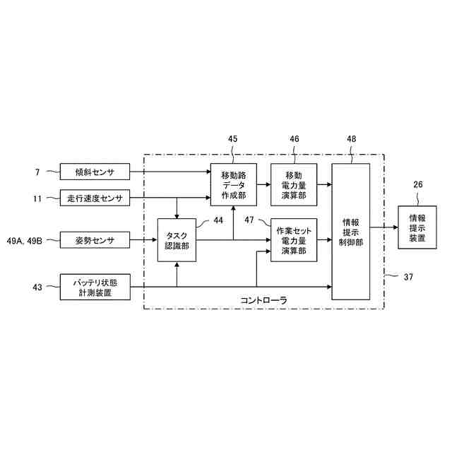 上記目的を達成するために、本発明は、蓄電装置と、前記蓄電装置で蓄えられた電力によって駆動される走行装置及び作業装置と、コントローラと、情報提示装置とを備えた電動式作業機械において、前記コントローラは、前記電動式作業機械が作業場から充電場まで移動するのに要する第1の電力量を演算し、前記電動式作業機械が1つの作業セットを行うのに要する第2の電力量を演算し、前記第1及び第2の電力量と共に、前記蓄電装置で蓄えられた電力量を前記情報提示装置に提示させる。