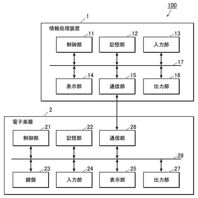 まず、本発明の実施形態に係る電子楽器システム100の構成について説明する。図1に示すように、電子楽器システム100は、情報処理装置1と、電子楽器2と、を備えて構成されている。情報処理装置1と電子楽器2は、無線又は有線によりデータ送受信可能に通信接続されている。電子楽器システム100は、アルペジエータとしての機能を提供するシステムである。