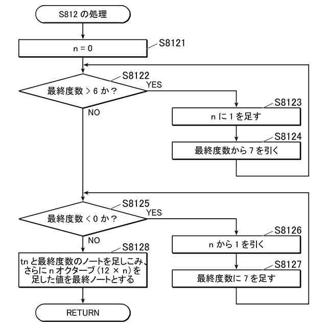 前記発音操作された操作子に対応する音高を当該音高より高い音高にシフトさせる場合、前記発音操作された操作子に対応する音高が前記楽曲データの調を構成する音高でない場合は、前記操作子に対応する音高を、前記楽曲データの調に応じたスケール上にあって前記音高よりも低くかつ前記音高に最も近い音高を補正値とし、音高値を加算し、前記発音操作された操作子に対応する音高を当該音高より低い音高にシフトさせる場合、前記発音操作された操作子に対応する音高が前記楽曲データの調を構成する音高でない場合は、前記操作子に対応する音高を、前記楽曲データの調に応じたスケール上にあって前記音高よりも高くかつ前記音高に最も近い音高を補正値とし、音高値を減算する、
