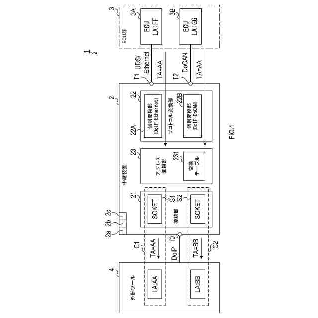 【解決手段】プロトコル変換部22は、外部ツール4との通信に用いる第1プロトコルと、ECU3A,3Bとの通信に用いる第2プロトコルとの変換を相互に行う。アドレス変換部23は、変換テーブル231に従って、対ツールアドレスと対ECUアドレスとを相互に変換する。1つの外部ツール4には、複数の対ツールアドレスが割り当てられる。変換テーブル231は、速度関連情報によって識別される第2プロトコルの種類毎に、異なる対ツールアドレスが紐づけられるように設定される。