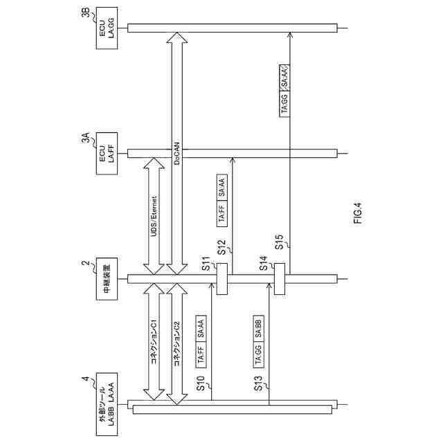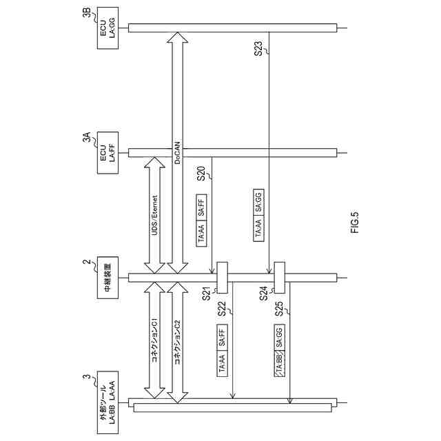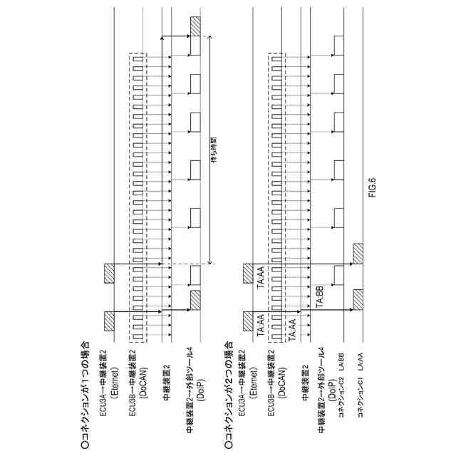 車載システムでは、外部ツールと中継装置との接続にイーサネットが用いられ、診断対象となる複数のECUと中継装置との接続に、イーサネットとCANとが混在する場合がある。イーサネット及びCANは登録商標である。イーサネットにおけるダイアグ通信は、例えばDoIPが知られており、CANにおけるダイアグ通信は、例えばDoCANが知られている。DoIPでは1フレームで送信できる長さのデータであっても、DoCANでは複数フレームに分割して送信する必要がある。