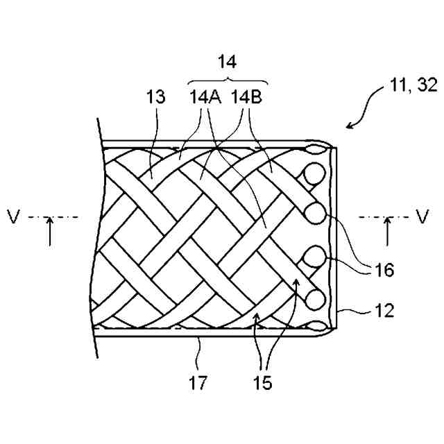 前記チューブは、樹脂製の内層と、前記内層の前記径方向の外側に設けられ、第1金属線材と第2金属線材が編組状に配された補強層と、前記補強層の前記径方向の外側に設けられた樹脂製の外層とを有し、