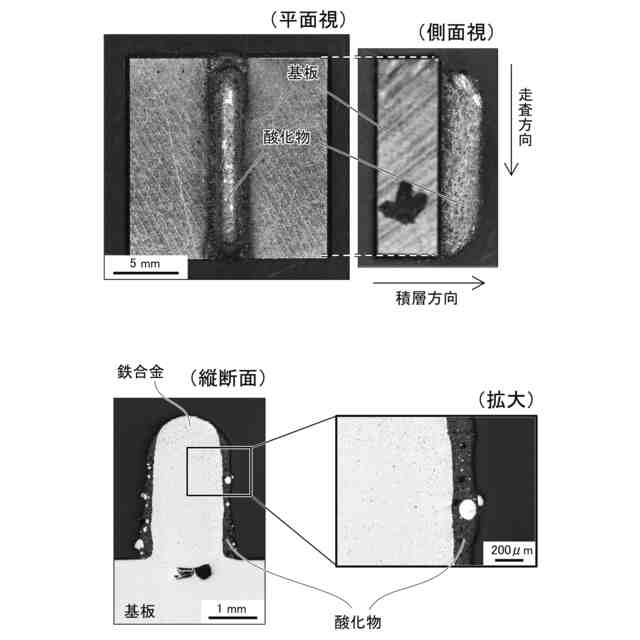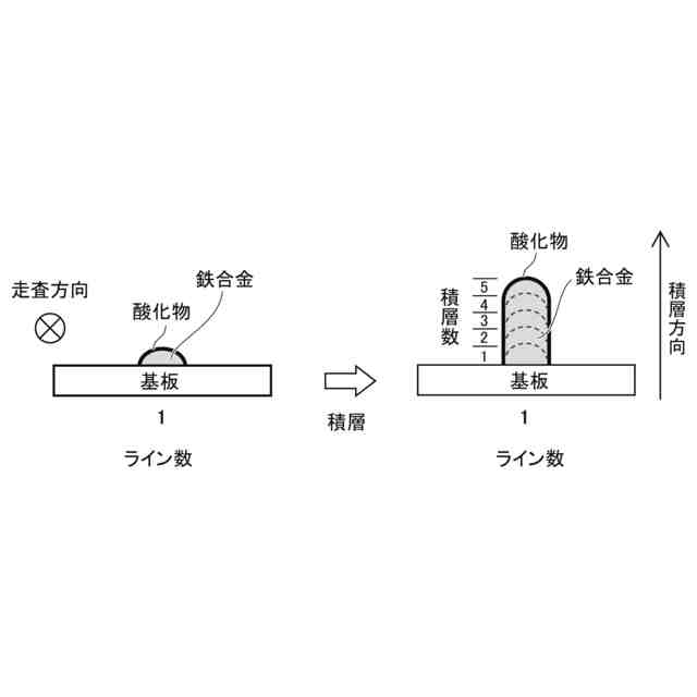 (1)本発明は、鉄基体と酸化物体が交互に重なってそれぞれ複数配置された重合体を有する積層造形物である。