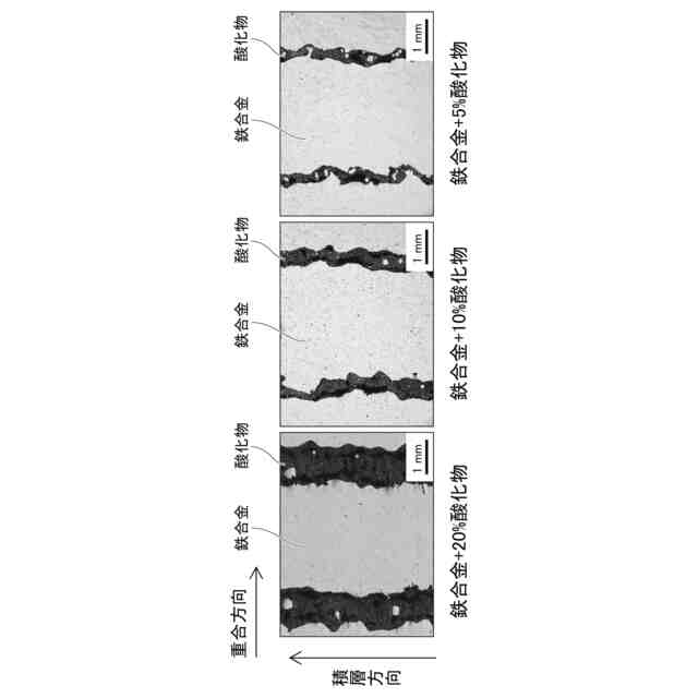 【解決手段】本発明は、鉄基体と酸化物体が交互に重なってそれぞれ複数配置された重合体を備える積層造形物である。例えば、鉄基体はSiおよび/またはAlを含み、酸化物体はFe、Si、Cr、Al、Mn、Mg、CaまたはTiの一種以上を含む。一例として、鉄基体は軟磁性体であり、酸化物体は絶縁体である。このような重合体は、例えば、高エネルギービームの照射により原料粉末を溶解させてできた溶融池が、鉄基液相と酸化物液相に分離され、鉄基液相が凝固して鉄基体となり、酸化物液相が鉄基体を囲繞しつつ凝固して酸化物体となって得られる。