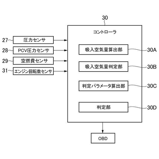 本発明によれば、シリンダに吸入する空気量を、吸気管圧力とエンジン回転数と排ガス中の空燃比とに基づいて算出するから、判定パラメータを求める場合の吸入空気量を正確に算出できる。すなわち、還流路を通って過給器に到る気体がエアーフローメータを通らない構成の場合、還流路に穴開きなどの異常によって外気を吸入してしまう場合には、吸入空気量がエアーフローメータで得られる量より多くなるが、本発明では、そのようなエアーフローメータによらずに、実吸入空気量を算出するから、判定パラメータを求める際の吸入空気量を正確なものとすることができる。言い換えれば、吸入空気量を実際より少なく求めてしまったり、それに伴って判定パラメータを求める機会(すなわち異常判定の機会)が少なくなってしまったりすることを回避もしくは抑制することができる。