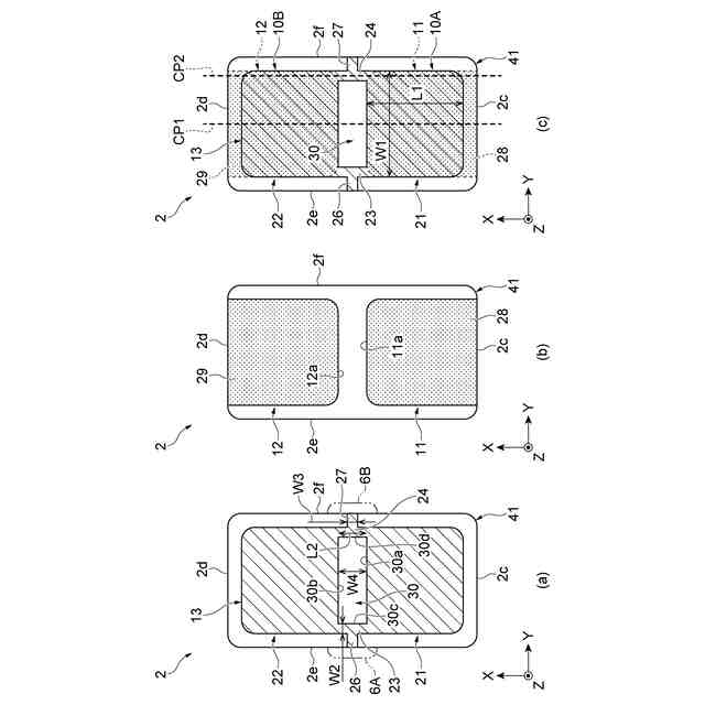 第3の内部電極は、開口部よりも第1の端面側の第1の領域と、開口部よりも第2の端面側の第2の領域と、第1の領域と第2の領域とを連結する連結部と、を備え、連結部は、外部連結導体が設けられる側面側に形成されてよい。この場合、連結部を外部連結導体と近づけることができる。従って、第3の内部電極の外部連結導体への引出部の長さを短くすることで、引出部の電流によるジュール熱を低減し、当該ジュール熱により破損する可能性を小さくすることができる。