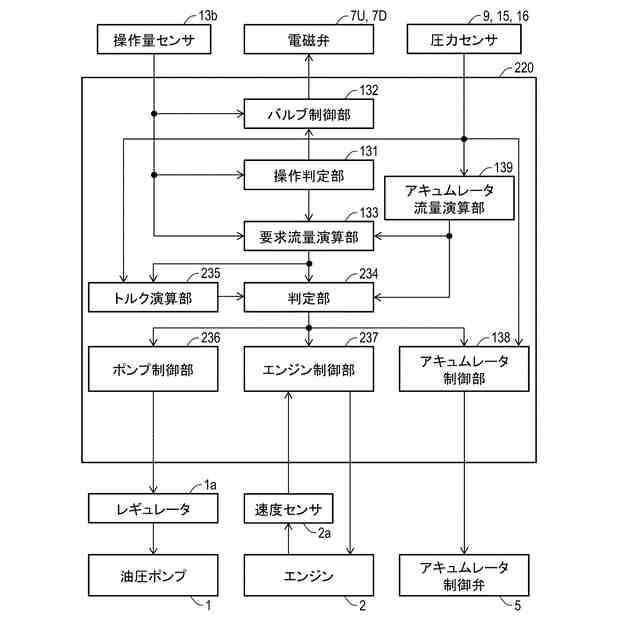 このように、特許文献1に記載の技術では、アキュムレータと油圧ポンプによる油圧アクチュエータへの作動油の供給分担が不連続的に変わる。このため、油圧アクチュエータも不連続的に動作することになり、作業機械のオペレータに違和感を与えてしまったり、油圧シリンダにより駆動される駆動対象部材の位置決めを精度よく行うことができなくなってしまったりするおそれがある。このため、アキュムレータと油圧ポンプによる油圧アクチュエータへの作動油の供給分担が変わるときに、油圧アクチュエータへの作動油の供給流量の連続性を確保可能な技術が要望されている。