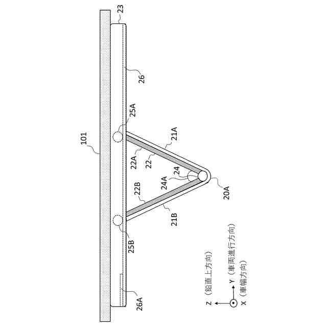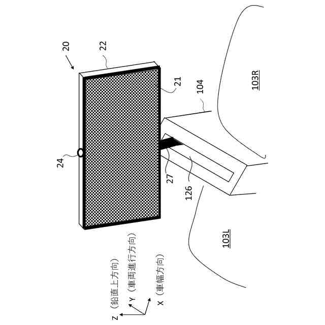図1乃至図4を参照して、第1実施形態に係るディスプレイ20、表示方法、表示システムおよびプログラムが説明される。図1は、本実施形態のディスプレイ20の利用の仕方を例示する図である。図1は、矢印A1を挟んで上下2つの状態をディスプレイ20が取り得ることを例示する。図1は、車両の2列目のシートから1列目(運転席、助手席)方向を見た車内を例示する。本実施形態では、運転席は座席102R、助手席は座席102Lと呼ばれる。ディスプレイ20は、例えば、1列目のシートと2列目のシートとの間付近で車両の天井101に吊り下げて設置される。なお、本実施形態は、車両の進行方向をY軸、鉛直上方向をZ軸、車幅方向で、車両の左側(助手席側)から右側(運転席側)に向く座標軸をX軸とする(図3参照)。