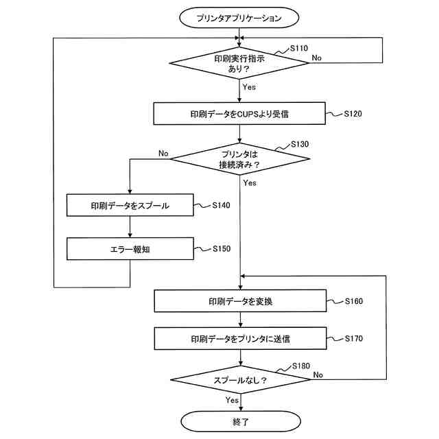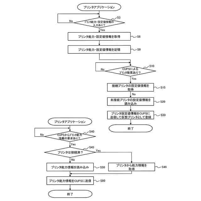 CUPSがプリンタアプリケーションを仮想プリンタとして登録した後、ユーザにより印刷実行指示がなされた場合の制御手順の一例を表すフローチャートである。