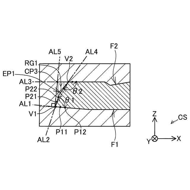 前記一対の主面のうちの一方の主面に沿った第1仮想線と、前記端面部のうちの前記一方の主面に接続する部分に沿った第2仮想線とが成す角度と、