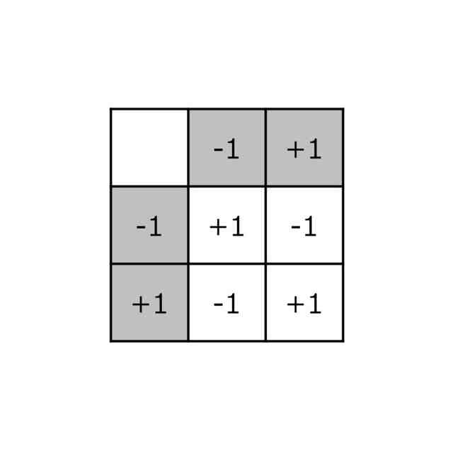 4値を取りうる2つの1次元データ同士の内積値を示す図。