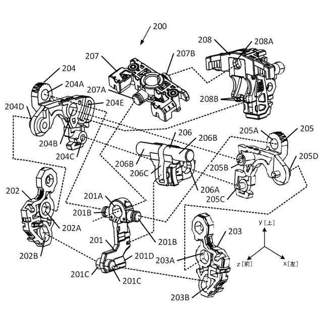 まず図1を参照して、本実施形態に係る模型玩具100の外観構成の一例について説明する。図1(A)は模型玩具100の外観正面を示し、図1(B)は模型玩具100の外観側面を示す。なお、x,y,zの矢印はそれぞれ模型玩具における上、左、前方向の向きを示し、他の図面についても同様である。