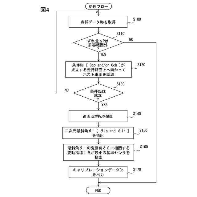 【解決手段】処理装置のプロセッサは、各光学センサによる走査点群を表す点群データDpを、取得することと、各光学センサ別の点群データDpにおいて走行路面を走査した路面点群Psを抽出することと、ホスト車両の左右方向及び前後方向に沿って定義される基準水平面に対して、各光学センサ別の路面点群を近似した近似平面が傾斜する傾斜角θiを監視することと、傾斜角θiに生じた変動角δθに追従して増大する変動指標Iθが最小となる基準センサを探索することと、基準センサ以外となる他の光学センサの点群データDpにおける走査点群の走査位置を、基準センサの点群データDpにおける走査点群の走査位置を基準にキャリブレーションするキャリブレーションデータDcを出力することとを、実行するように構成される。