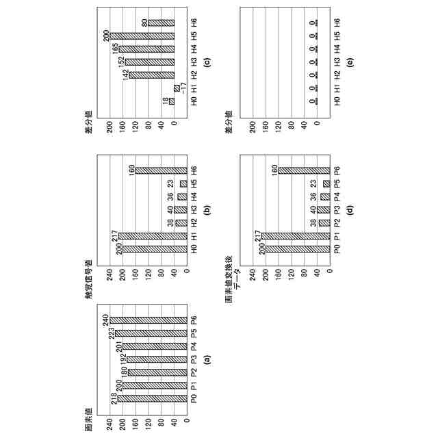 第1の実施形態における対応する画素値、触覚信号値、画素値変換後データ、および差分値の具体例を示した図。