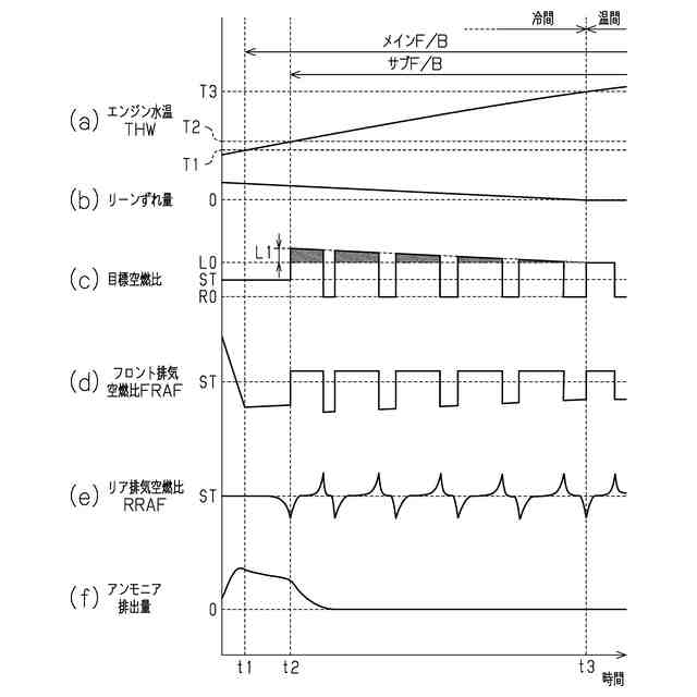 冷間運転時のリーン側目標空燃比のリーン補正を行わない場合の、(a)はエンジン水温の推移を、(b)はリーンずれ量の推移を、(c)はメインフィードバックの目標空燃比の推移を、(d)はフロント排気空燃比の推移を、(e)はリア排気空燃比の推移を、(f)はアンモニア排出量の推移を、それぞれ示すタイムチャートである。
