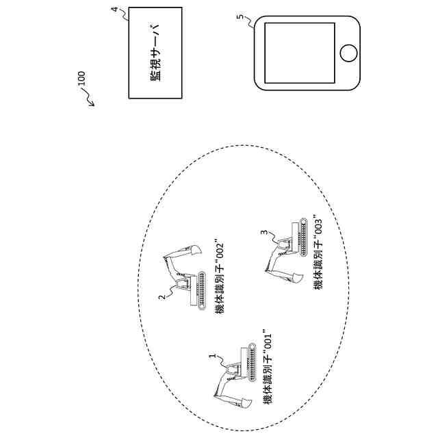 図1は、監視システム100の概念図である。監視システム100は、複数の作業機械1、2、3のそれぞれが、車体の異常を第三者目線で相互に監視するシステムである。監視システム100は、例えば、複数の作業機械1、2、3と、監視サーバ4と、監視端末5とを備える。なお、作業機械1~3の数は3台に限定されない。また、監視サーバ4及び監視端末5の一方または両方は、省略可能である。