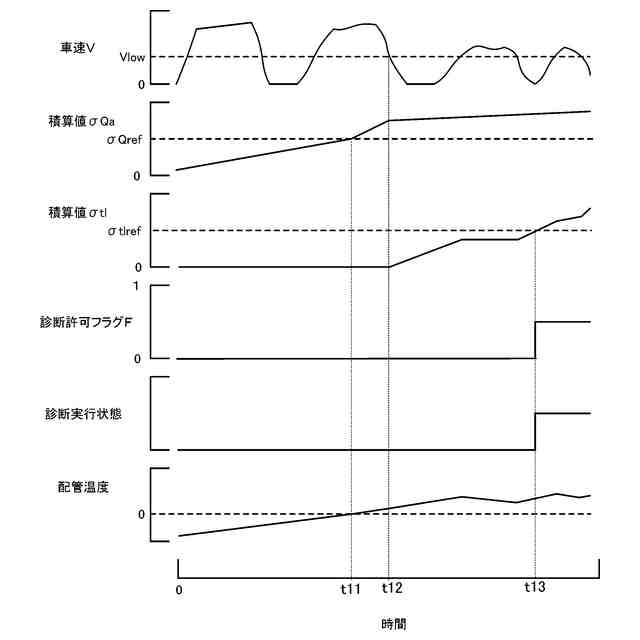 また、本開示の車両診断装置において、前記圧力センサを用いた前記車両の診断の実行が許可されており、前記圧力配管の凍結が推定される場合において、所定低負荷で走行した時間の積算値が低負荷時間判定値を超えているときには、前記圧力センサを用いた前記車両の診断の実行を禁止してもよい。圧力配管内の水の凍結が推定される場合において、所定低負荷状態での走行の時間が長いときには短いときに比して、排気管の暖機が進まず排気管の温度の上昇が抑制され、圧力配管を充分に暖機することができない。そのため、圧力配管内の水分が凍結し、圧力センサを用いた車両の診断を実行すると誤診断する可能性がある。したがって、圧力センサを用いた車両の診断の実行が許可されており、圧力配管内の水の凍結が推定される場合において、所定低負荷で走行した時間の積算値が低負荷時間判定値を超えているときには、圧力センサを用いた車両の診断の実行を禁止することにより、圧力センサを用いた誤診断を抑制できる。ここで、「低負荷時間判定値」としては、排気管の暖機により圧力配管が受熱して内部の氷が融解しているか否かを判定するための閾値として予め設定された値を挙げることができる。