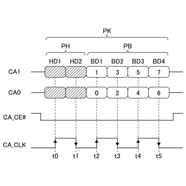第1実施形態に係るメモリシステムにおけるコマンド及びアドレスの入力動作のシーケンスの一例を示す図。